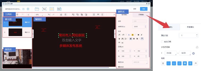 屬性區(qū):設(shè)置展示素材的屬性,文字,圖片,以及頁面屬性等;設(shè)置內(nèi)容的播放方式,如輪播、定時(shí)播放、互動(dòng)播放等,并可以控制播放的進(jìn)度和暫停/繼續(xù)。